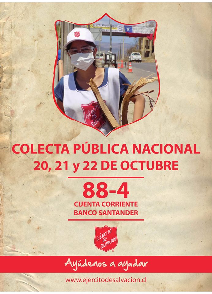 Esta actividad se realizará durante los días 20, 21 y 22 de Octubre, en la cual podemos realizar nuestros aportes voluntarios y así apoyar esta Colecta Pública Nacional “Ayúdanos a Ayudar” del Ejército de Salvación. Dios bendiga a cada persona que saldrá a colectar este año y también a cada persona que ayudará con un aporte: