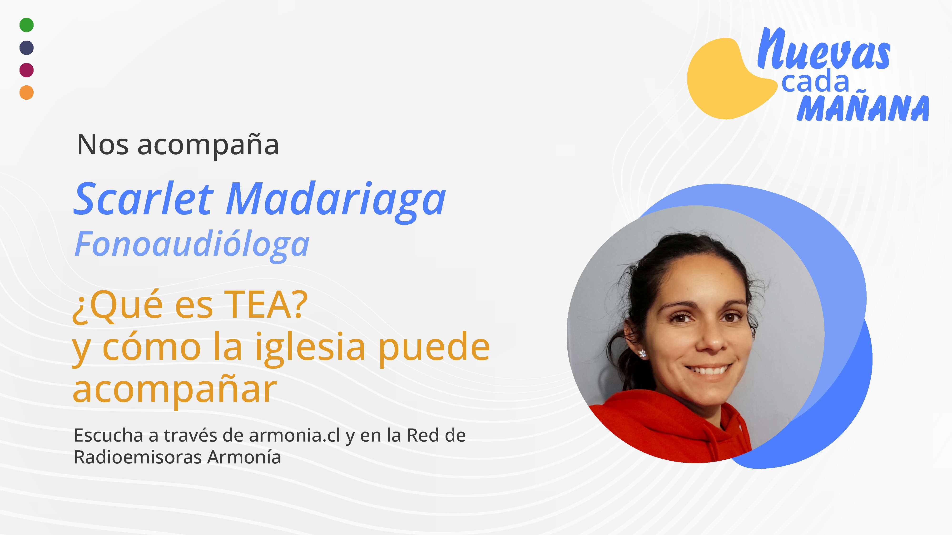 Los días martes a partir de las 10:00 horas, como es habitual en Nuevas Cada Mañana, tenemos distintos invitados o invitadas a compartir una amena conversación referente a temas que nos interesan como sociedad. Fue así que este martes recién pasado estuvo como invitada la hermana fonoaudióloga Scarlet Madariaga, quien abordó un tema muy especial titulado “¿Qué es TEA? y cómo la iglesia puede acompañar.