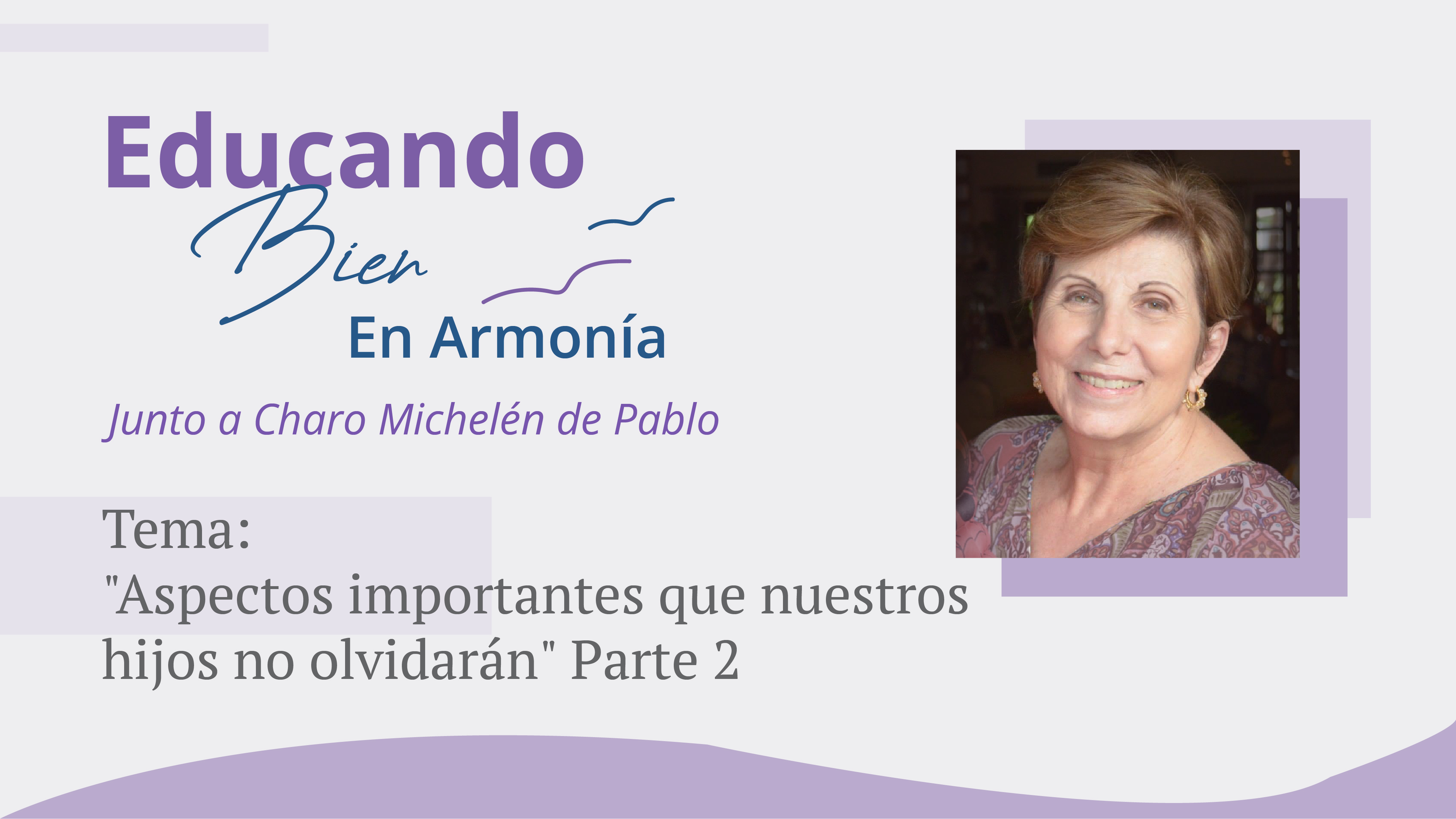El martes 18 de octubre las hermanas la hermana Charo Michelén y María Cristina Munizaga estuvieron conversando acerca de "Los Aspectos importantes que nuestros hijos no olvidaran" en el espacio del programa “Educando Bien en Armonía”, Educando Bien suena en Armonía cada Martes a las 10:00 hrs. trayendo enseñanzas bíblicas sobre la crianza de los hijos.